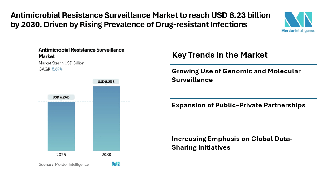 The antimicrobial resistance surveillance market is valued at USD 6.24 billion in 2025 and is forecasted to reach USD 8.23 billion by 2030, progressing at a 5.69% CAGR during the period, rising data-sharing initiatives, and broader adoption of connected laboratory workflows. As policymakers and health systems increase investment in surveillance programs, the antimicrobial resistance surveillance market size continues to expand across regions with improved readiness, expanded screening programs, and wider integration of genomic tools.