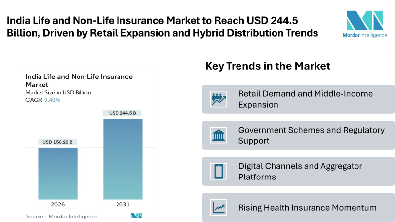 According to Mordor Intelligence, the India life and non-life insurance market size is valued at USD 156.2 billion in 2026 and is projected to reach USD 244.5 billion by 2031, reflecting a CAGR of 9.4% during the forecast period. This India life and non-life insurance market forecast highlights steady expansion across both protection and savings products, supported by regulatory clarity, rising income levels, and broader distribution reach.
