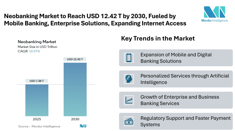 According to Mordor Intelligence, the Neobanking Market size stands at USD 7.38 trillion in 2025 and is forecast to reach USD 12.42 trillion by 2030, reflecting a CAGR of 10.97%. These services appeal to a tech-savvy customer base that values convenience, speed, and real-time financial management.