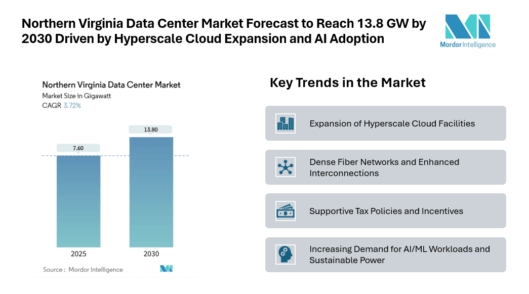The Northern Virginia data center market reached an installed IT load of 7.6 GW in 2025 and is forecast to expand to 13.8 GW by 2030, reflecting a 3.72% CAGR during the period. This growth highlights the increasing Northern Virginia Data Center Market size, driven by strategic investments from hyperscale cloud providers, and the presence of high-density fiber networks that support seamless interconnections.