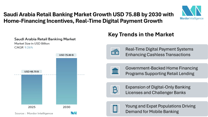 According to Mordor Intelligence, the Saudi Arabia retail banking market size stands at USD 48.7 billion in 2025 and is forecast to reach USD 75.8 billion by 2030, advancing at a 9.26% CAGR. Online banking is becoming an increasingly significant part of retail transactions, while Islamic finance continues to play a major role in total banking assets.