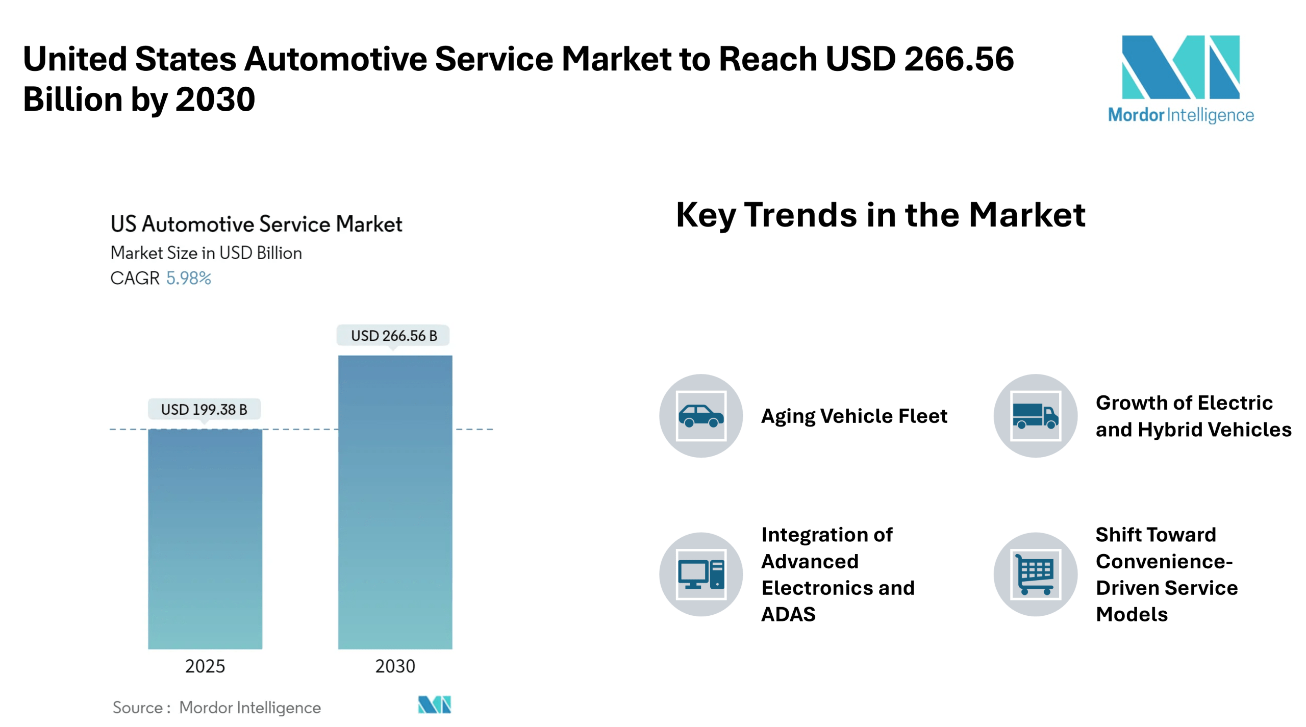 The United States automotive service market is on track to grow from an estimated USD 199.38 billion in 2025 to approximately USD 266.56 billion by the year 2030 translating into a 5.98% CAGR. This expansion will stem from a combination of factors including an aging vehicle fleet, increased vehicle usage, and rising complexity in service requirements. As the United States automotive service market size expands, stakeholders across the sector repair workshops, parts suppliers, service networks and technology providers will find increasing opportunities to capture share. An understanding of the United States automotive service market share, united states automotive service market analysis, and united states automotive service market trends is essential for players seeking to position themselves ahead of change.